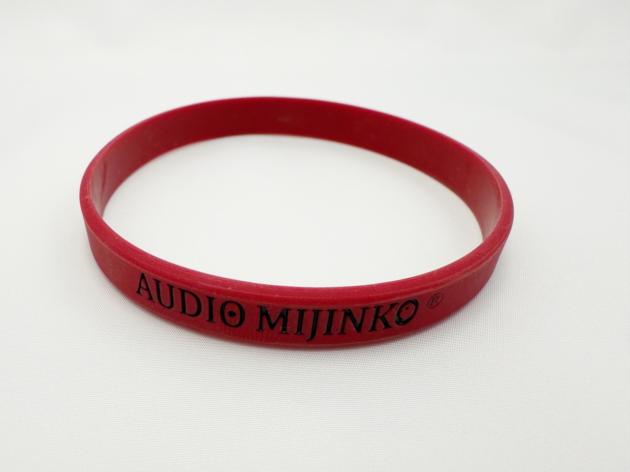 深みのあるえんじ色に、ブラックの「AUDIO MIJINKO®」ロゴをあしらったシリコンバンド。