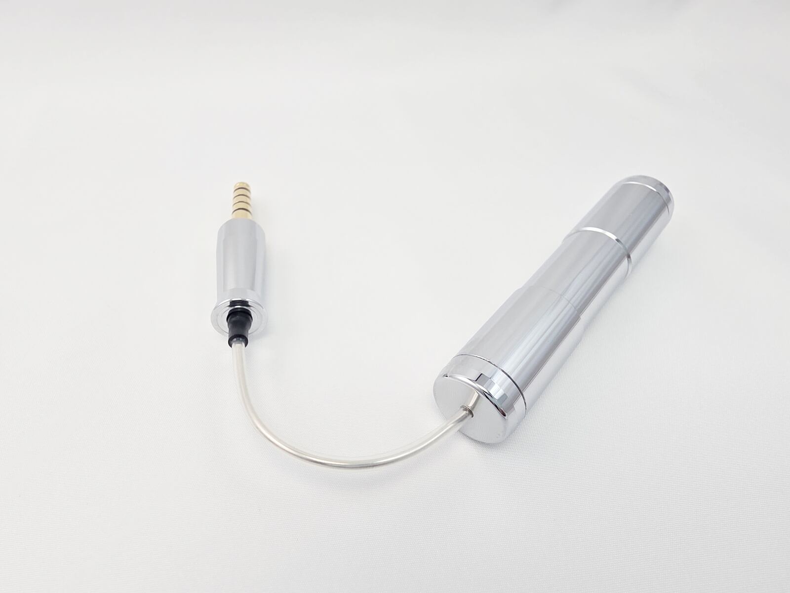 採用されているのは、金メッキ電極/真鍮クロームメッキカバーの当店オリジナル4.4プラグ。プラグ根元のS極(グランド)と仮想アース本体は、4N純銀単線のリード線で接続されています。絶縁にはPEチューブを用い、リード線長は約8cm。柔軟性に富み、DAPやポータブルアンプの脇に自然に配置できます。