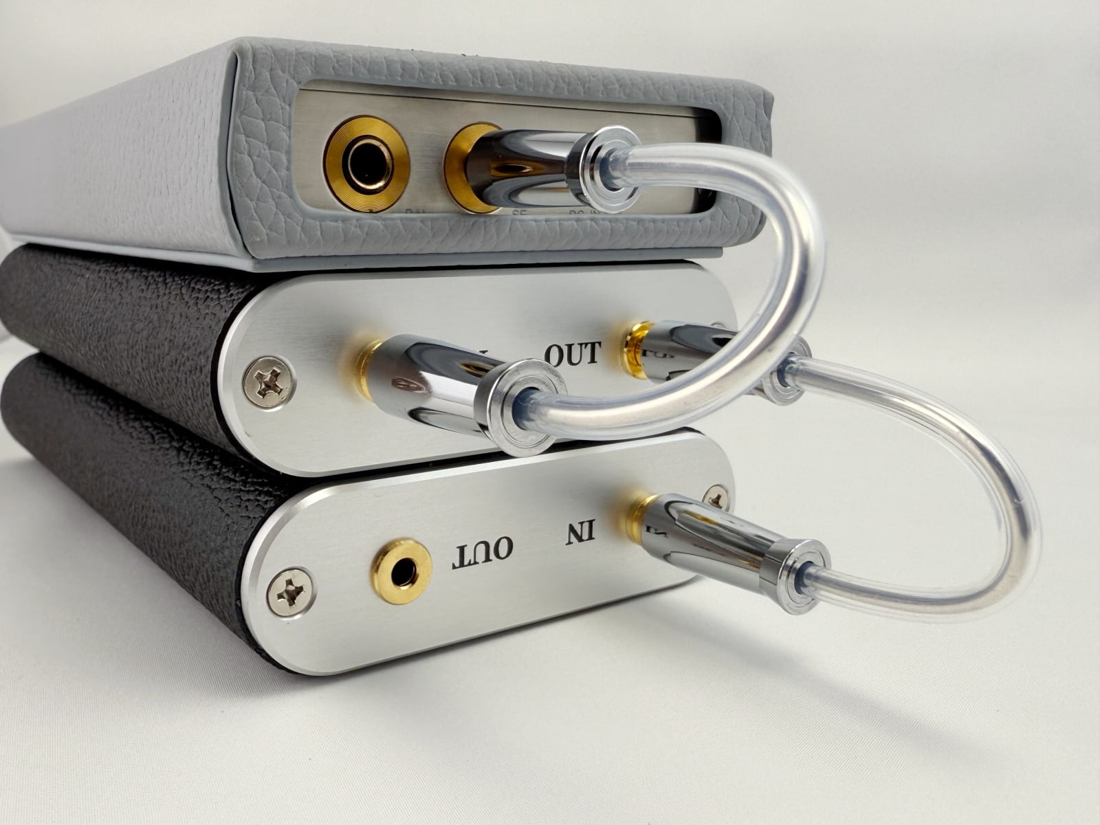 付属アース線(3.5mm to バナナプラグ)を使えばスタッキングも容易。