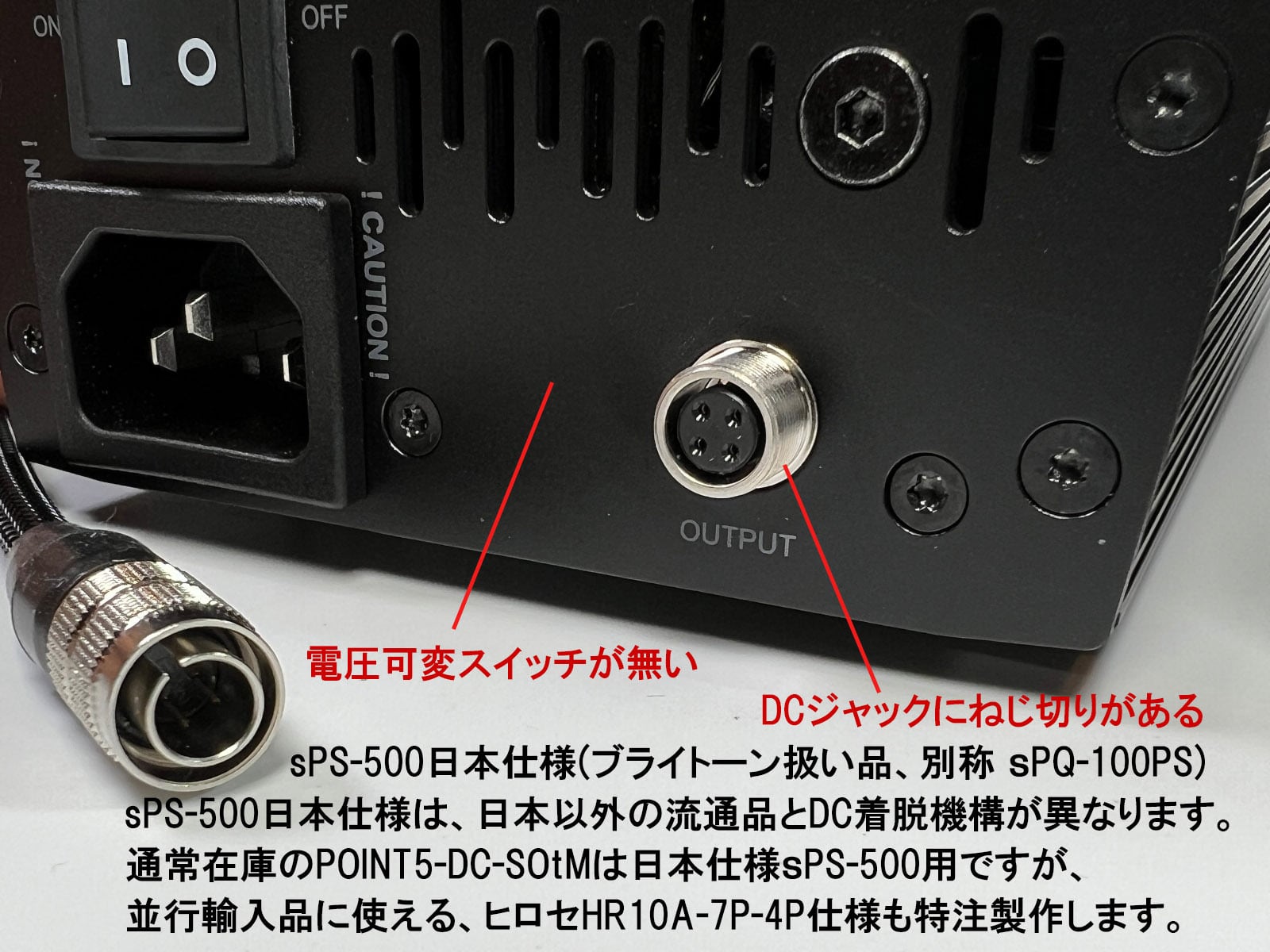sPS-500には、SoTM日本正規代理店ブライトーン扱いの日本仕様と、日本以外で流通している仕様(日本では並行輸入品扱い)の2種類があります。PSE法の絡みで、sPS-500日本仕様は電圧可変スイッチを排し、かつDC着脱機構が独自の物になっております。日本仕様と並行輸入品との見分け方を解説付き写真で追加しました。