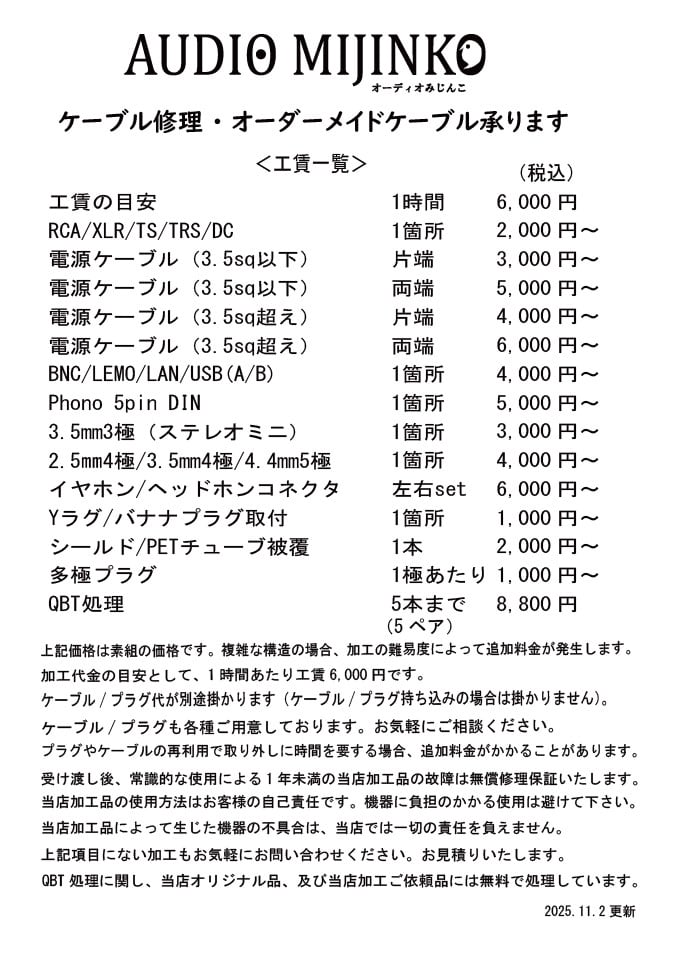 また、レコードプレーヤーの直出しフォノケーブル、電源ケーブルの修理、交換も行っておりません。